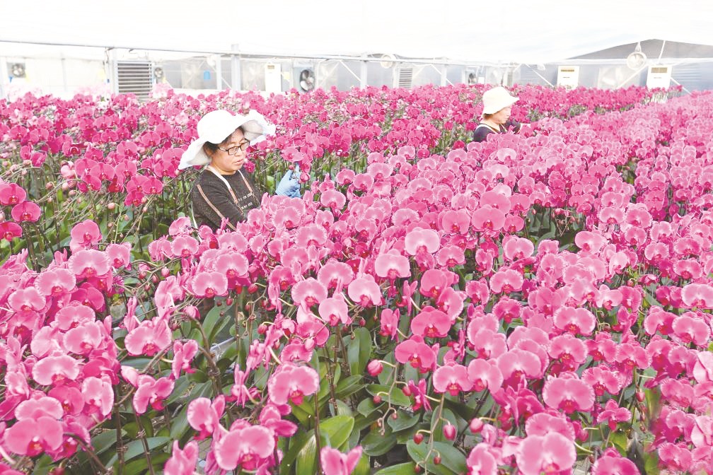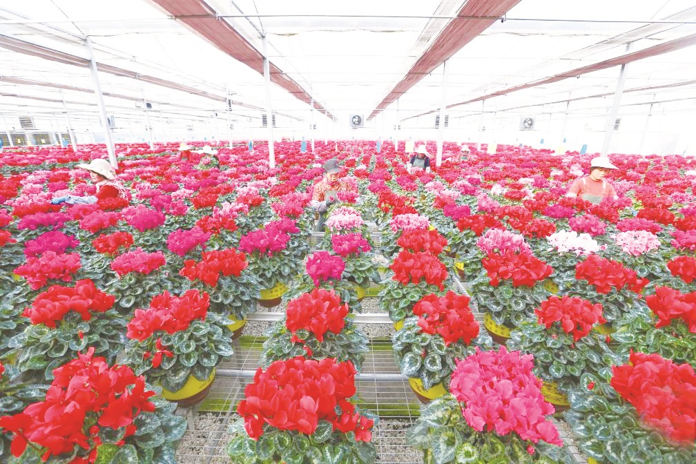 ▲花农在青岛市即墨区灵山花卉文化产业园管护花卉。