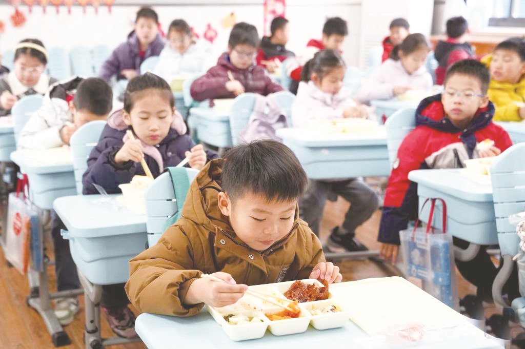 2月2日,2026年上海市小学生爱心寒托班正式开班,迎来超1万名小学生报到。今年的寒托班由共青团上海市委、上海市教委牵头开办,在全市设297个办班点,数量较2025年进一步增加,助力缓解小学生假期“看护难”。图为在上海市普陀区长征镇办班点,寒托班的小学生在用午餐。