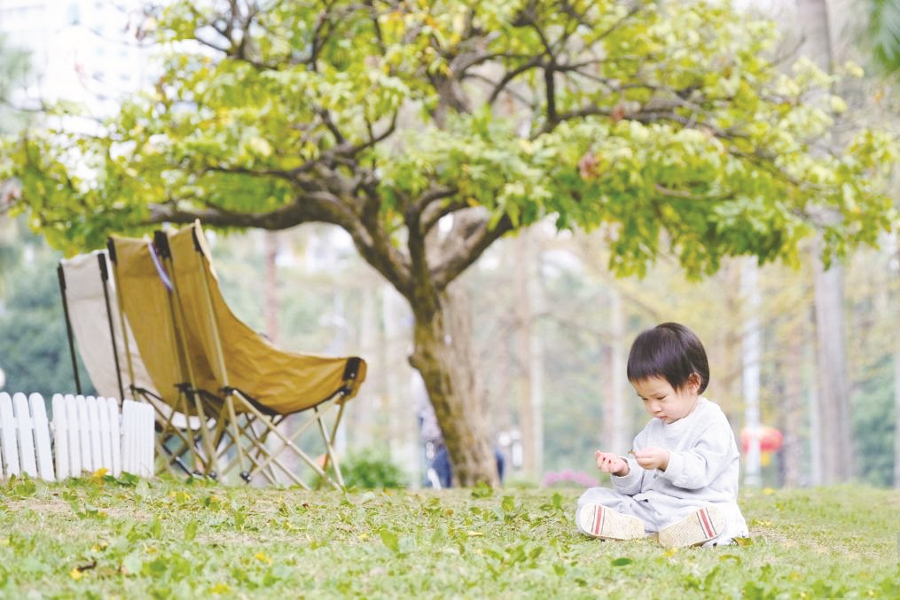 一名小朋友在广西南宁市南湖边绿地上玩耍。(曹正平/摄)
