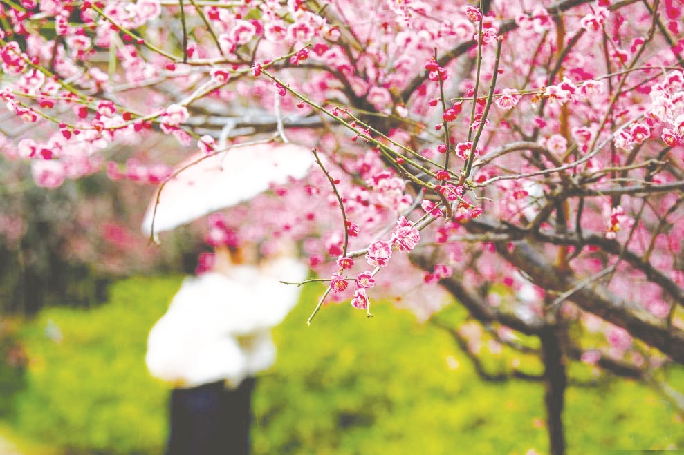 一场春雨过后,晶莹剔透的雨珠缀满枝头,勾勒出别样春日景致。图为在江苏省泰州市梅兰芳公园,游客冒雨赏花。