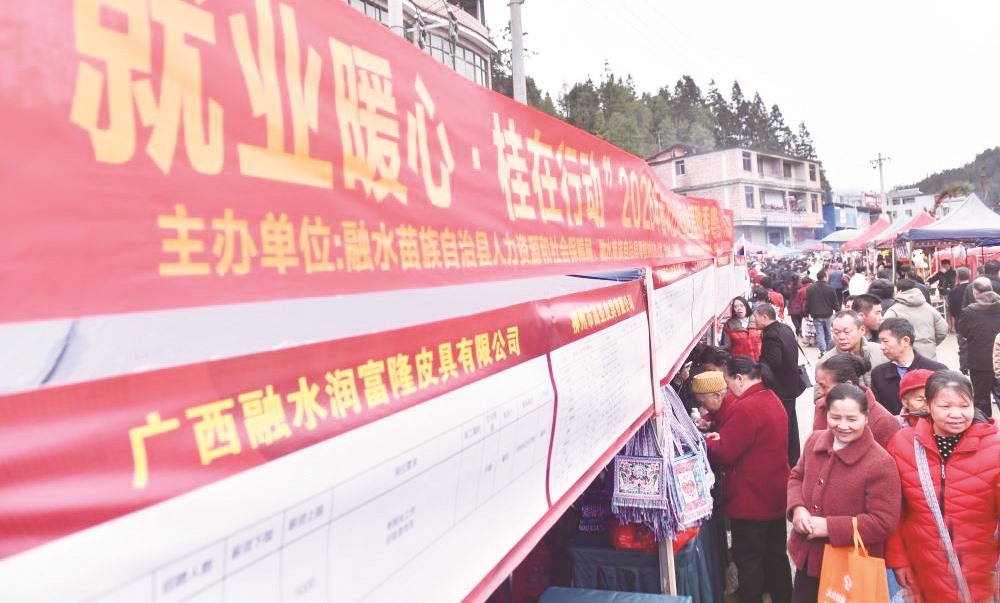 近日,广西柳州市融水苗族自治县在安太乡“十三坡会”上举行2026年春风行动暨就业援助季粤桂劳务协作专场招聘会,两地多家企业提供数百个工作岗位。图为在融水苗族自治县安太乡“十三坡会”上,人们在了解岗位需求信息。