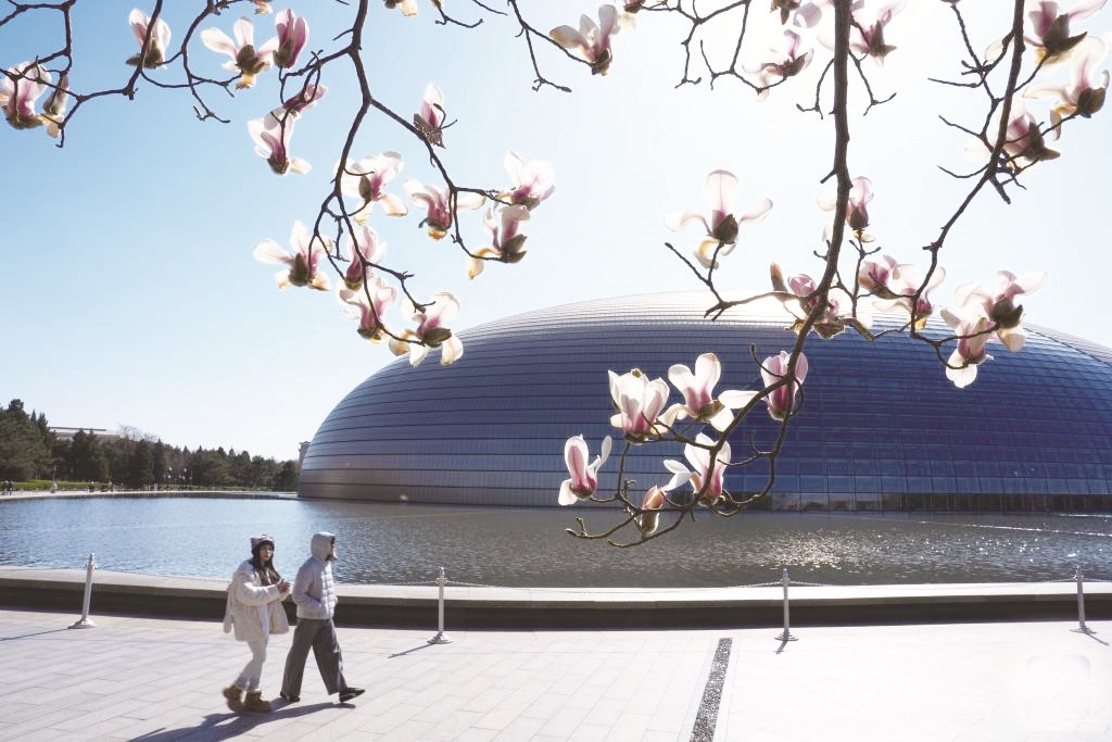 近日,随着气温回升,北京街头的玉兰花渐次开放。图为国家大剧院旁玉兰花盛开。