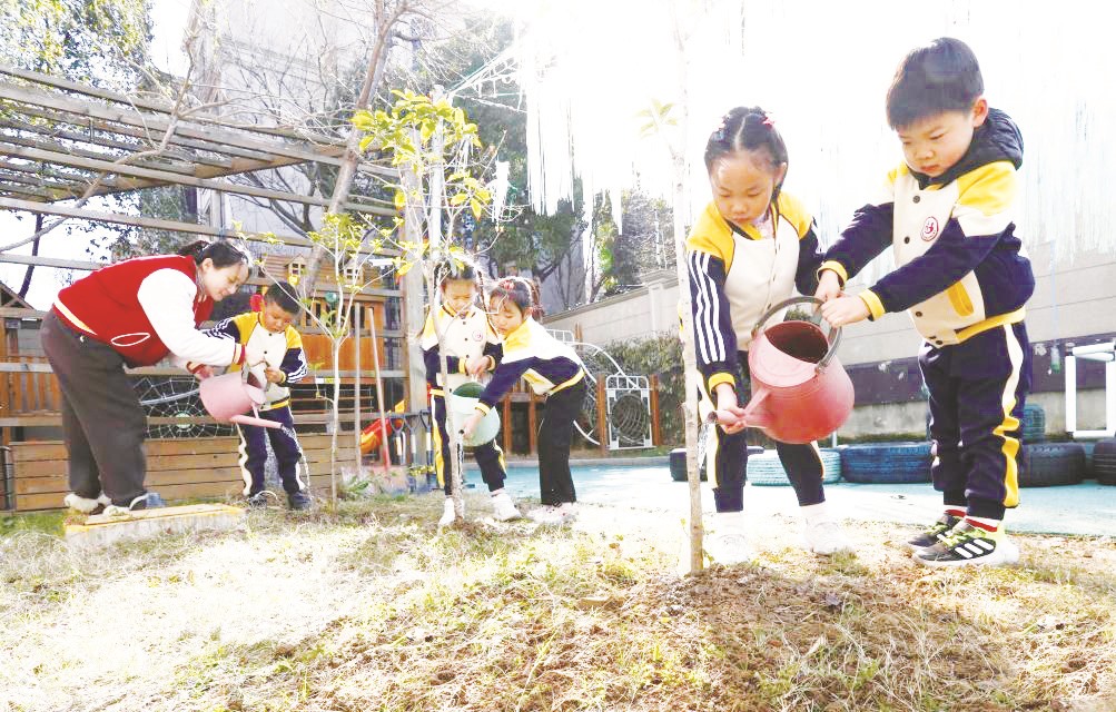 植树节前夕,人们在春光中参加植树活动,为大自然增添新绿。图为3月10日,在江苏苏州高新区实验幼儿园,孩子们和老师一起给刚栽种的树苗浇水。