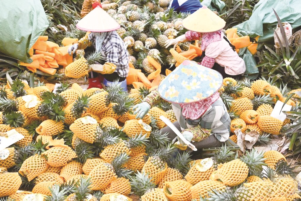 近日,海南省海口市琼山区大坡镇的金钻凤梨种植基地迎来集中采收期,当地农户抢抓农时采摘凤梨。图为农民在海口大坡镇将凤梨打包装箱。