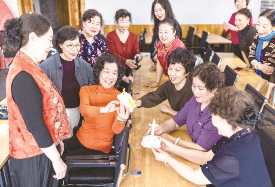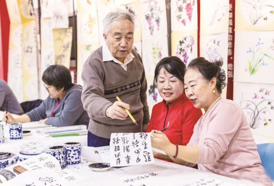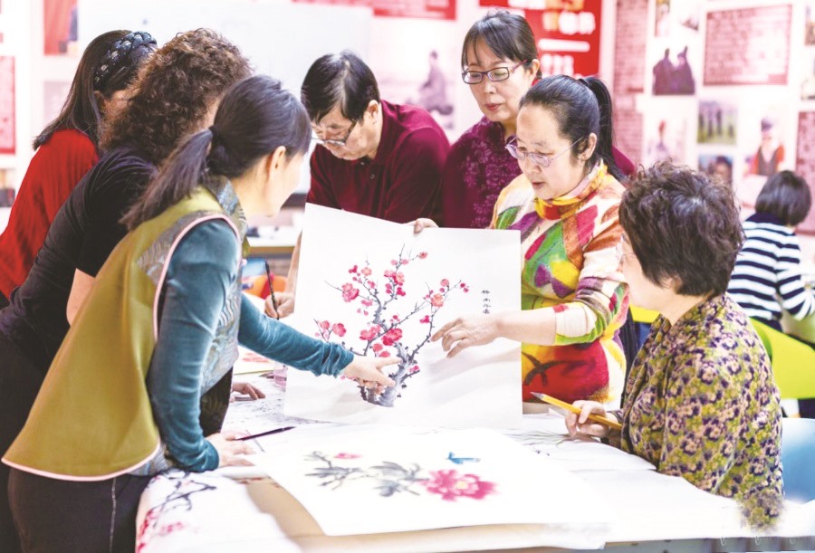 ▲老年学员在呼和浩特市玉泉区老年大学绘画课上交流国画技艺。