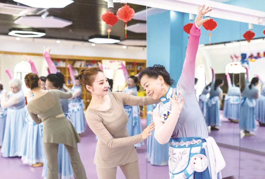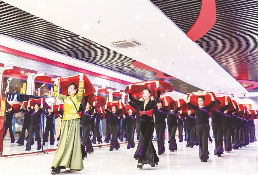 ▲老年学员在呼和浩特市玉泉区老年大学民族舞课上学习舞蹈。
