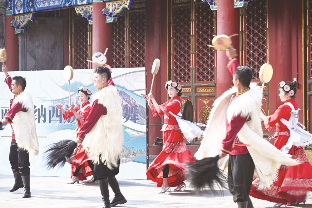 近日,“和美流芳——丽江木府历史文化主题展”在北京恭王府博物馆开幕。该展由恭王府博物馆与云南省丽江市人民政府联合策划,精选70余件珍贵文物,系统讲述丽江木氏土司维护国家统一、促进民族交融的事迹。图为演员在开幕式上表演纳西族勒巴舞。