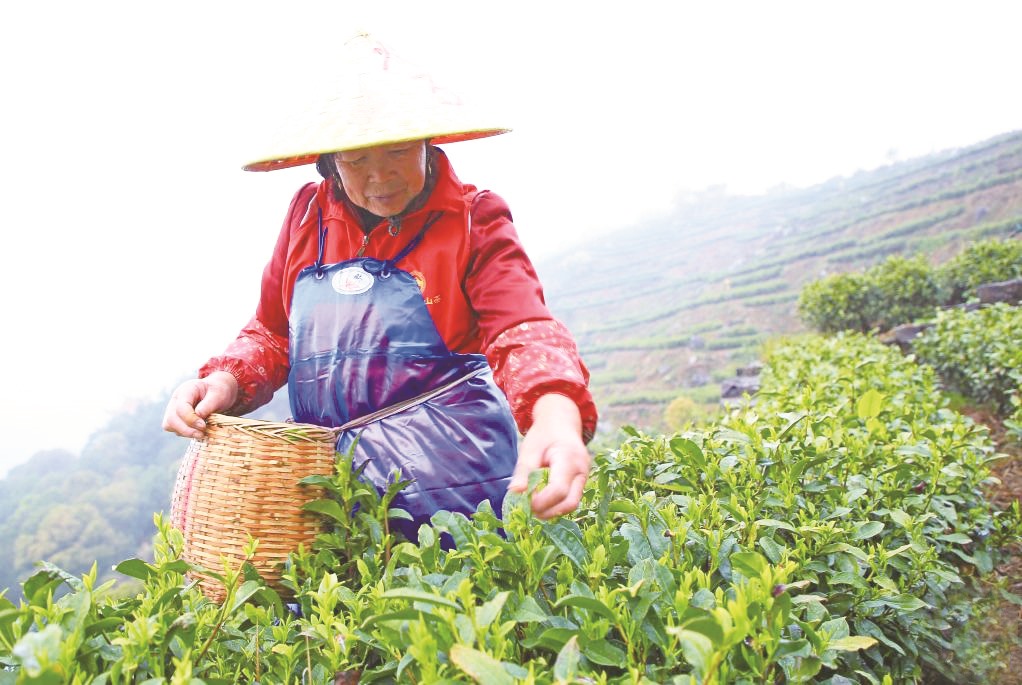 清明临近,各地茶园陆续进入采摘期,茶农忙着采摘明前茶,供应市场。图为采茶工在浙江省玉环市大麦屿街道石峰山火山茶基地采摘明前茶。