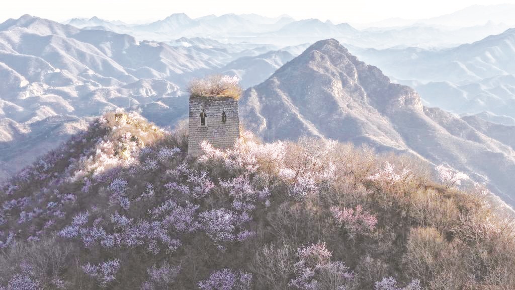 近日,随着气温回暖,河北省唐山市迁西县的长城周边山花烂漫,美如画卷。图为在河北省唐山市迁西县金厂峪镇拍摄的长城春景(无人机照片)。
