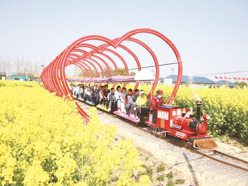 游客在江苏省淮安市盱眙县黄花塘镇向阳花海乘坐小火车游玩。(许昌银 /摄)