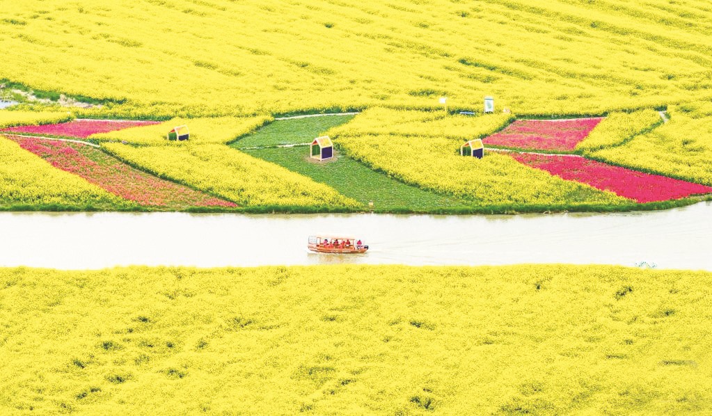 清明小长假期间,人们踏青赏景,乐享春光。图为游客在江苏省高邮市湖上花海景区乘船游玩 (无人机照片)。