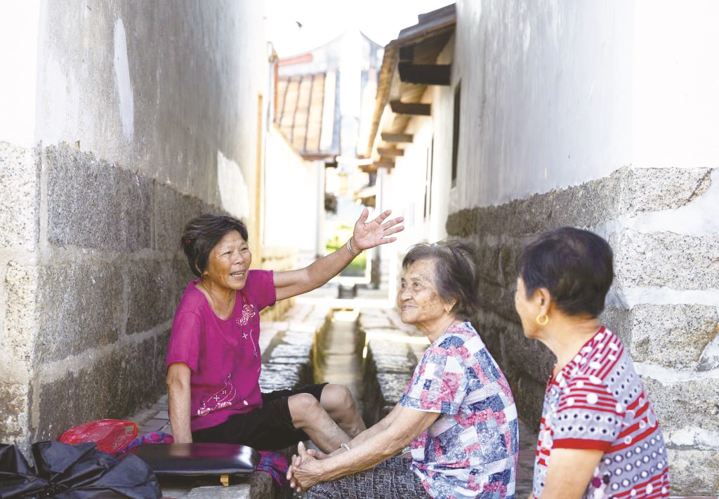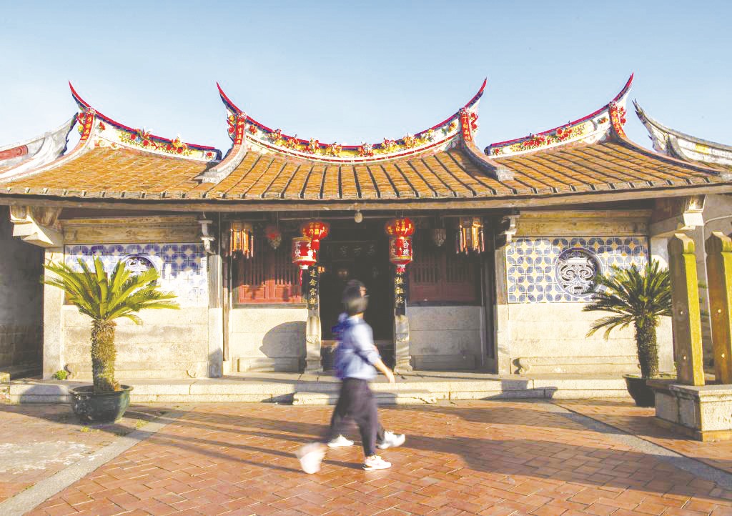 ▲两名游客走过漳州龙海区东园镇埭美村古厝。